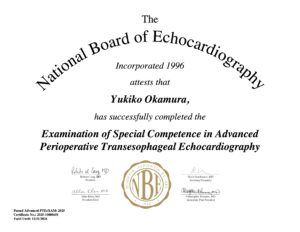 心臓麻酔科医や集中治療医を対象とした経食道心エコー(TEE)の上級資格試験NBE(National Board of Echocardiography)Advanced PTEeXAM(Advanced Perioperative Transesophageal Echocardiography Examination) に、熊本大学病院麻酔科専攻医プログラム後期研修中の岡村有希子先生(現 熊本赤十字病院所属)が合格しました!